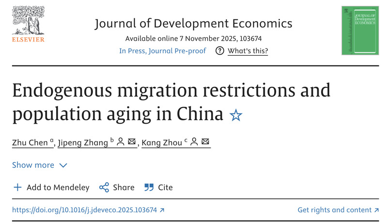 近日,我院周康研究员(通讯作者)的合作论文“Endogenous Migration Restrictions and Population Aging in China(内生的迁移限制与中国人口老龄化)”,被发展经济学顶级期刊 Journal of Development Economics (JDE)接受发表。论文合作者为西南政法大学陈翥老师与山东大学张吉鹏教授(联合通讯作者)。
