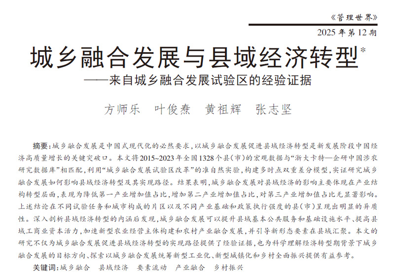 近日,我院研究员方师乐和叶俊焘的合作论文《城乡融合发展与县域经济转型——来自城乡融合发展试验区的经验证据》在《管理世界》2025年第12期正式刊出。合作者为浙江大学中国农村发展研究院黄祖辉教授和浙江工商大学经济学院张志坚副教授。《管理世界》是国务院发展研究中心主管主办的学术刊物,常年占据中国管理学学术期刊影响因子首位,是公认的国内经管类顶级期刊。