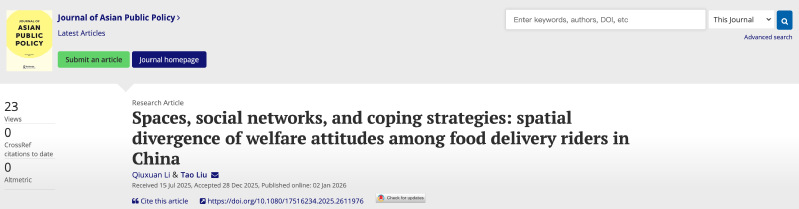 近日,我院研究员刘涛和博士研究生李秋璇的合作论文Spaces, social networks, and coping strategies: spatial divergence of welfare attitudes among food delivery riders in China在Journal of Asian Public Policy 期刊发表。