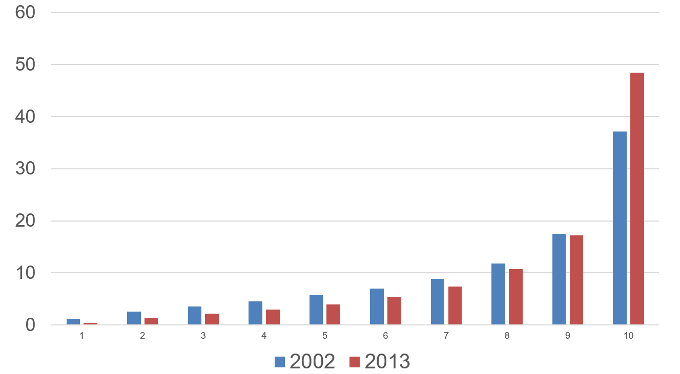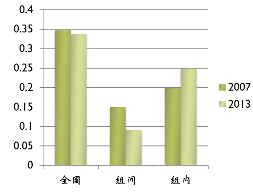 ① 2007-2013年,“组间”数值大幅下降,说明城乡之间收入差距对全国收入差距的贡献度降低;而“组内”数值上升,说明同期城镇内部、农村内部的收入差距有所扩大,成为影响全国收入差距的重要因素。